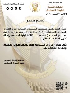 وأشار البيان إلى أن الترقيات والإحالات للتقاعد تمثل جزءاً من عملية التجديد داخل المؤسسة العسكرية، بما يحقق التوازن بين الخبرات المتراكمة والكوادر الجديدة، ويسهم في تعزيز الكفاءة المهنية وضمان انسيابية العمل المؤسسي بما يتوافق مع متطلبات المرحلة الحالية.