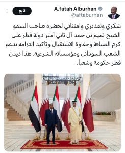 “شكري وتقديري وامتناني لحضرة صاحب السمو الشيخ تميم بن حمد آل ثاني أمير دولة قطر على كرم الضيافة وحفاوة الاستقبال وتأكيد التزامه بدعم الشعب السوداني ومؤسساته الشرعية. هذا ديدن قطر حكومةً وشعباً”.