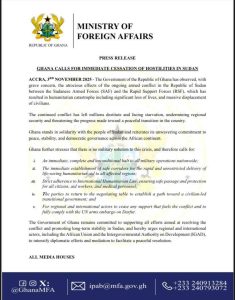 أصدرت وزارة الخارجية في جمهورية غانا امس الاثنين بيانًا صحفياً أعربت فيه عن بالغ قلقها إزاء الانتهاكات الجسيمة التي ارتكبتها المليشيا المتمردة في مدينة الفاشر، وما نجم عنها من كارثة إنسانية أودت بحياة العديد من الأبرياء وتسببت في نزوحٍ واسعٍ للمدنيين.